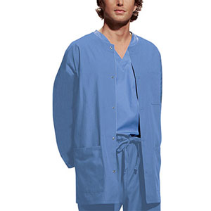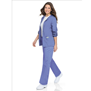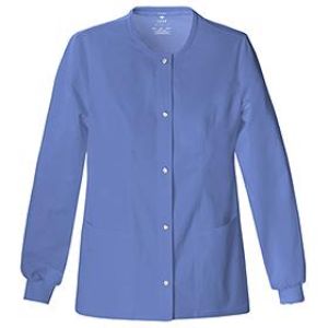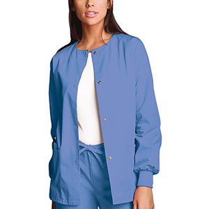 Jewel neck snap front warm-up with two patch pockets, knit cuffs, and a cell phone pocket. Center back length 27 1/2". |