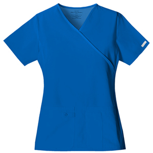 A mock wrap top features soft knit side panels, four pockets, including one scissor pocket on left and tab snap closure... |