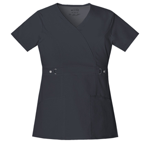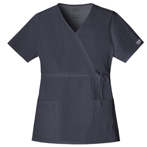 A mock wrap top features soft knit side panels, four pockets, including one scissor pocket on left and tab snap closure... |