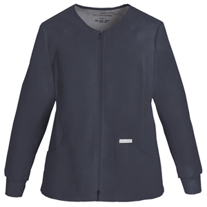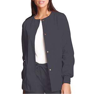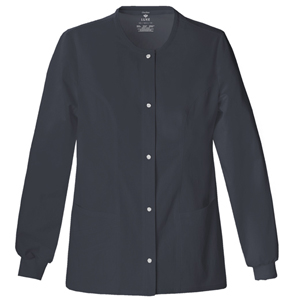 Jewel neck snap front warm-up with two patch pockets, knit cuffs, and a cell phone pocket. Center back length 27 1/2". |