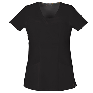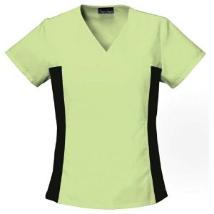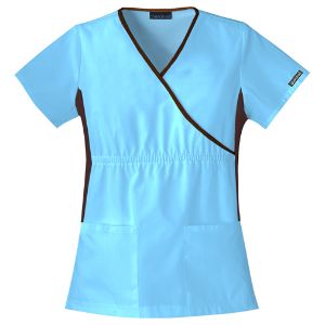 A mock wrap top features flattering and comfortable contrast knit side panels and two front patch pockets. Empire waist... |