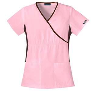 A mock wrap top features flattering and comfortable contrast knit side panels and two front patch pockets. Empire waist... |