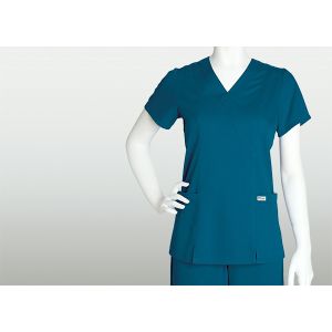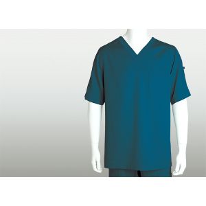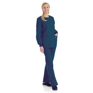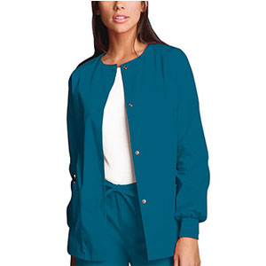 Jewel neck snap front warm-up with two patch pockets, knit cuffs, and a cell phone pocket. Center back length 27 1/2". |