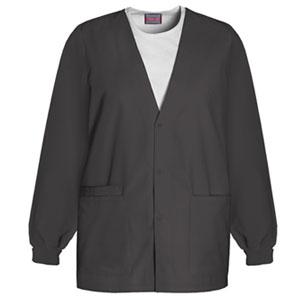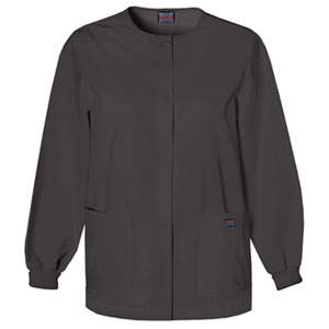 Jewel neck snap front warm-up with two patch pockets, knit cuffs, and a cell phone pocket. Center back length 27 1/2". |