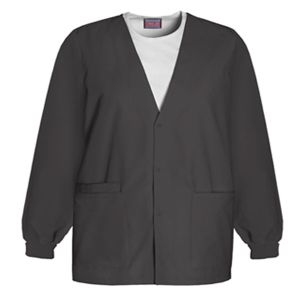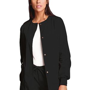 Jewel neck snap front warm-up with two patch pockets, knit cuffs, and a cell phone pocket. Center back length 27 1/2". |