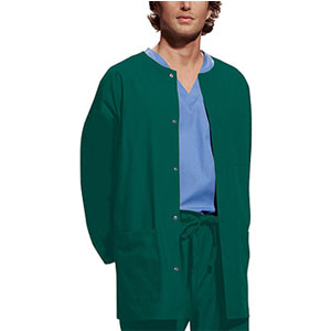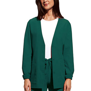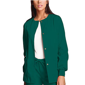 Jewel neck snap front warm-up with two patch pockets, knit cuffs, and a cell phone pocket. Center back length 27 1/2". |