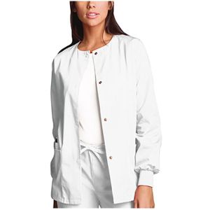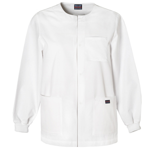 Jewel neck snap front warm-up with two patch pockets, knit cuffs, and a cell phone pocket. Center back length 27... |