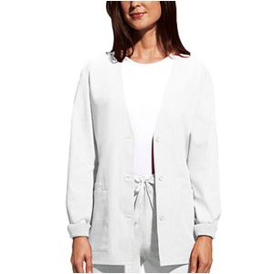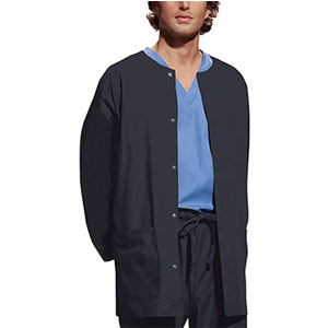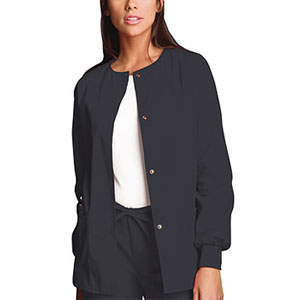 Jewel neck snap front warm-up with two patch pockets, knit cuffs, and a cell phone pocket. Center back length 27... |